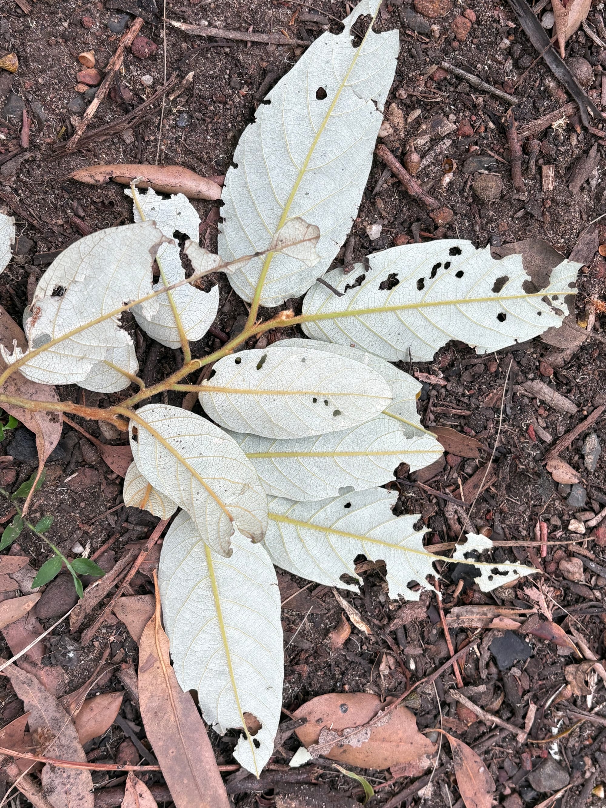 The Red Ash tree (Alphitonia excelsa) is one where characteristic leaf damage helps with recognition. As the summer advances, leaves can be almost skeletonised, and give the canopy a ‘lacy’ appearance. When the foliage is high up, leaf shape and colour can be difficult to discern, meaning that this lacy appearance is a useful feature to watch out for.