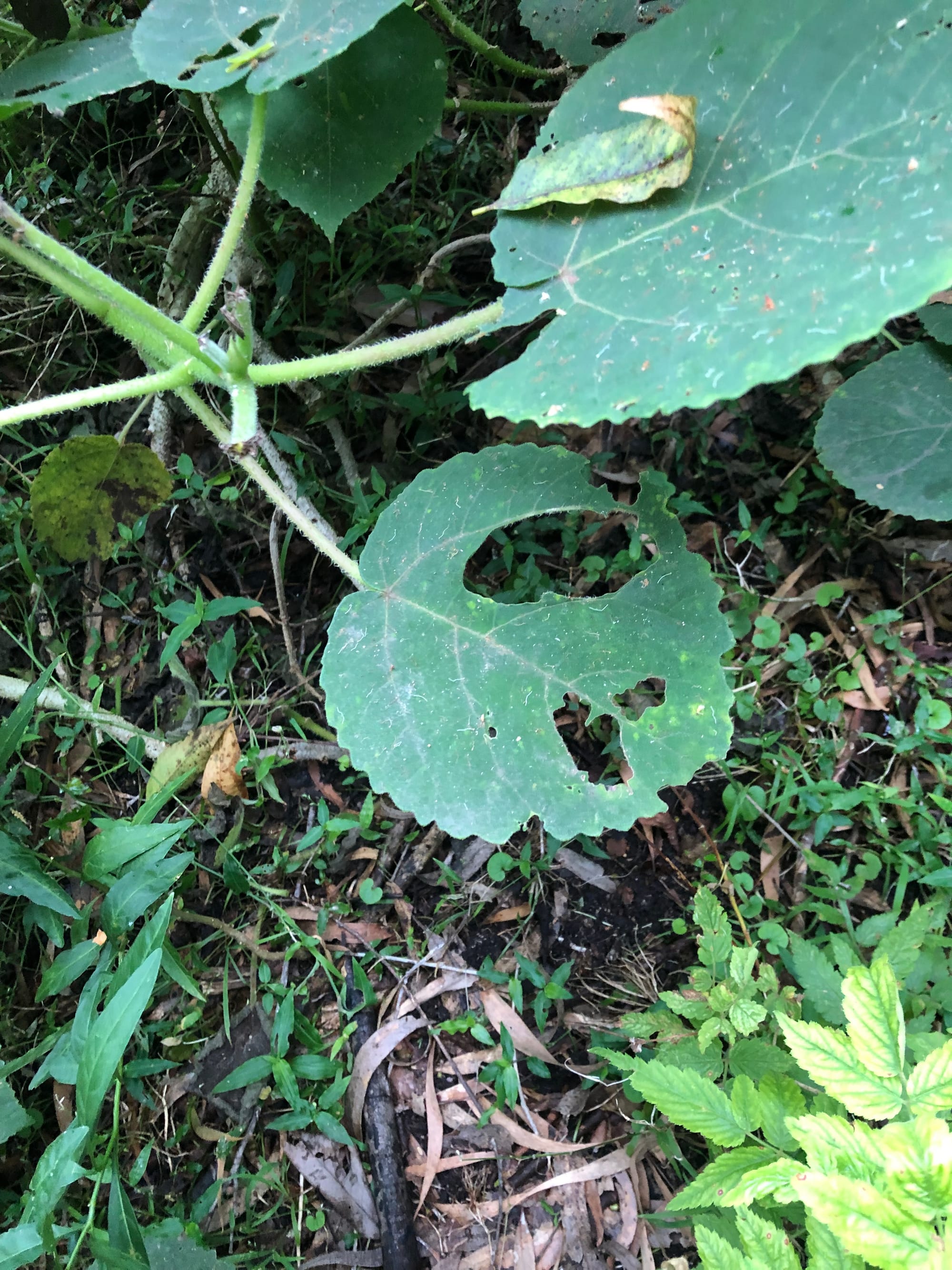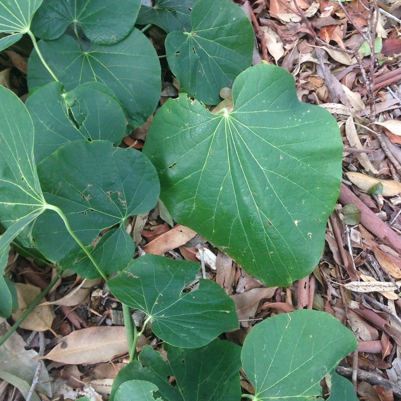 The presence of insect damage helps distinguish this species from the Round-leaf Vine (Legnephora moorei), which has a similar shape and size of leaf but rarely has insect damage evident. The fallen leaf shown below is from a Round-leaf Vine which, despite its age, has little sign of being munched on.