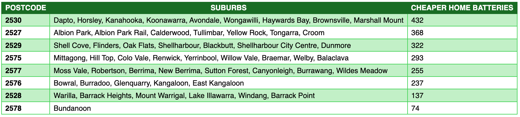 The highest uptake in the Whitlam electorate is in postcode 2530, where Dapto and other suburbs between the mountains and the lake are blazing a trail, putting in 432 home batteries since the program began in July 2025.
