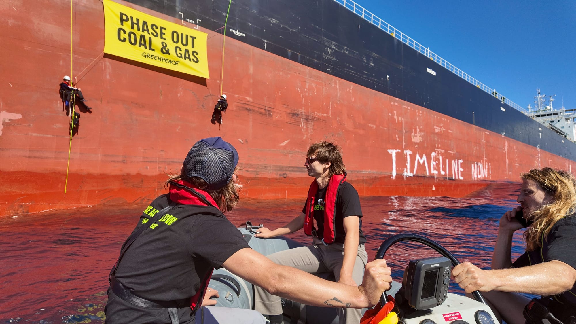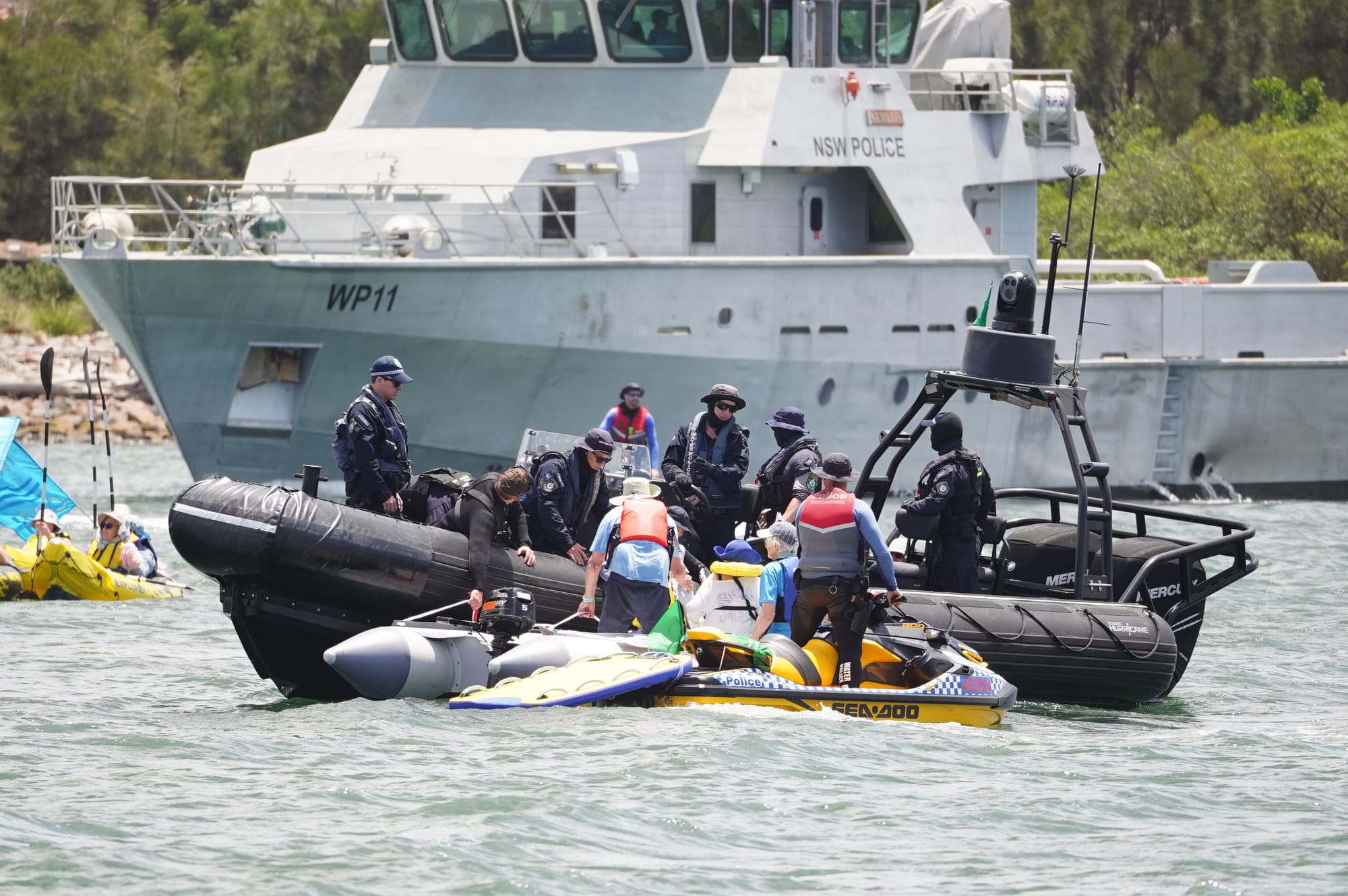 Hundreds of people joined the flotilla but only 141 were arrested, including two Greenpeace activists who hung off the side of a ship and unfurled a banner reading “Phase out coal and gas”.