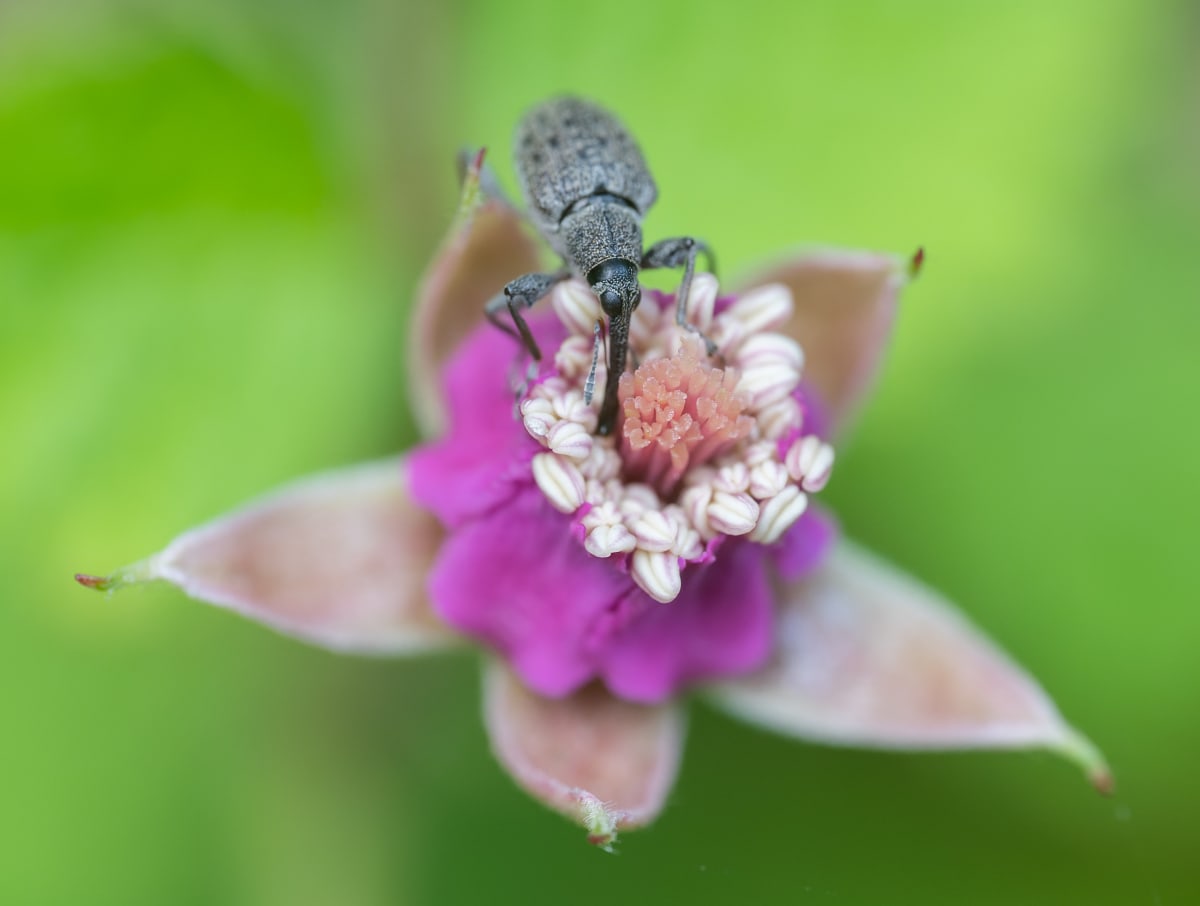 The other native raspberry species can do similar work, though they're all less commonly seen. They include the Native Raspberry or Small-leaf Bramble (Rubus parvifolius) which has incredibly pretty leaves, and delicious though quite tiny fruit. It is a favourite of insect pollinators such as weevils like this one we spotted in our back garden the other day.