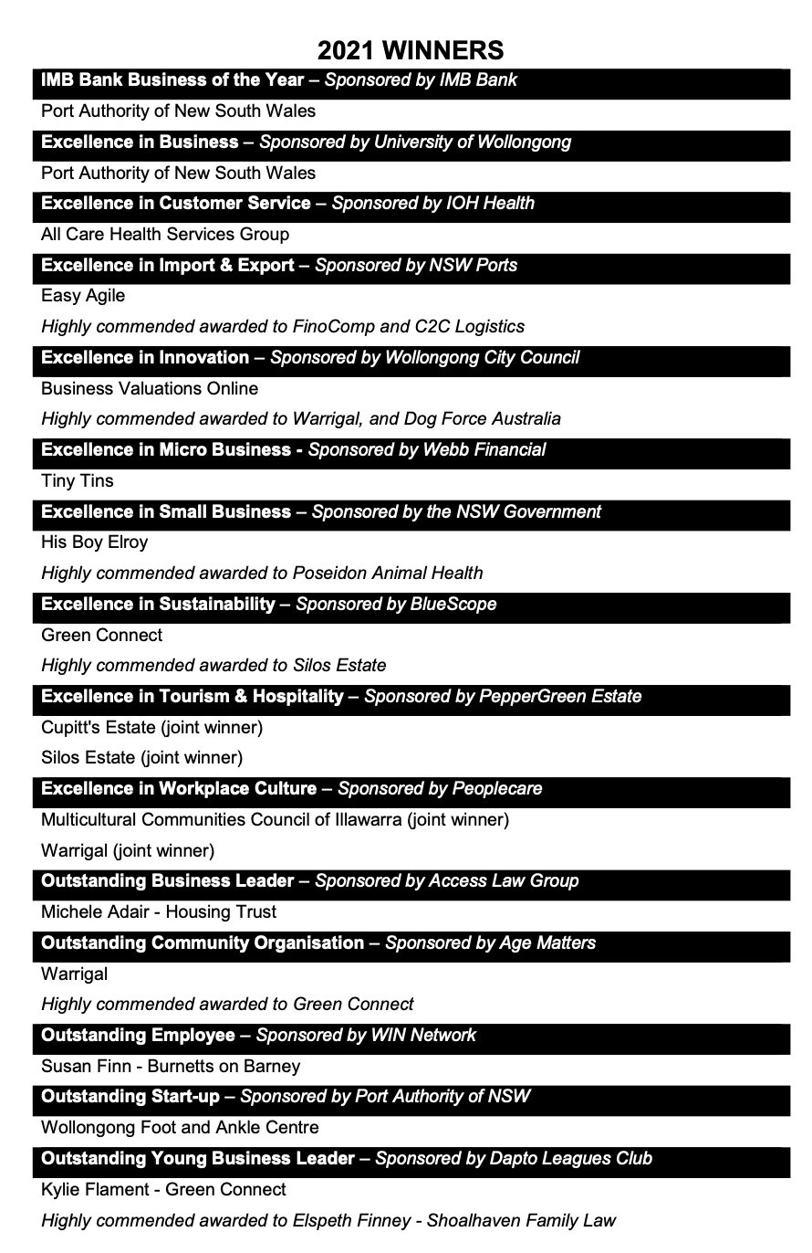 Winners of the 2021 IMB Bank Illawarra Business Awards
