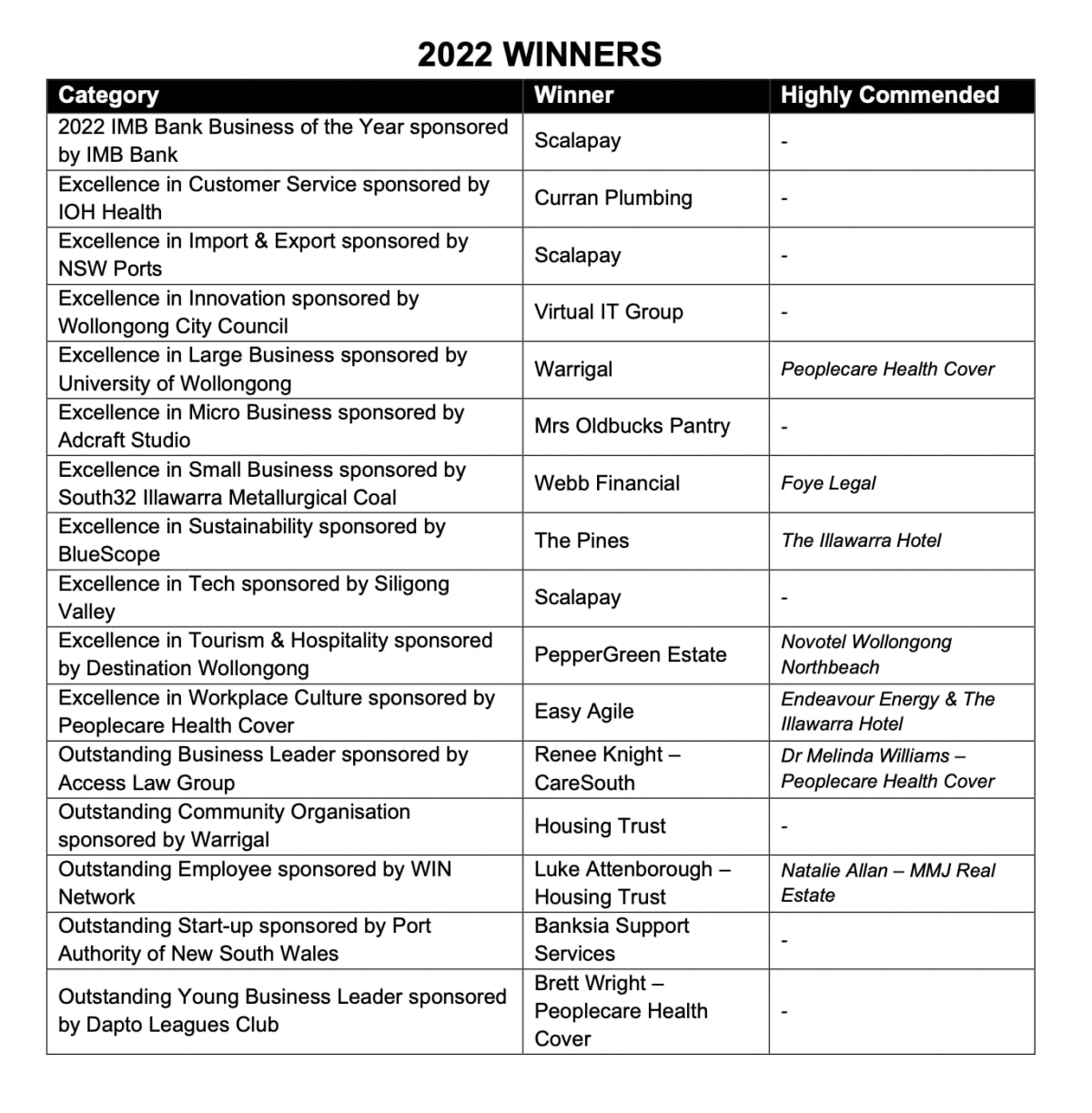 Business Illawarra media release: 15 October 2022 The region’s business community celebrated excellence at last night’s glamorous 2022 IMB Bank Illawarra Business Awards dinner at the WIN Entertainment Centre in Wollongong. This year’s awards...