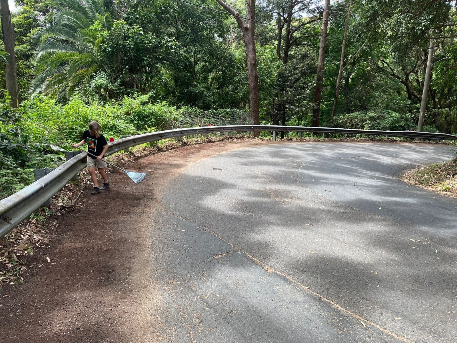 To make escarpment roads safer, residents have put up signs, swept verges and used a strategically placed yellow community trailer in an attempt to slow traffic and highlight hazards. Photos supplied