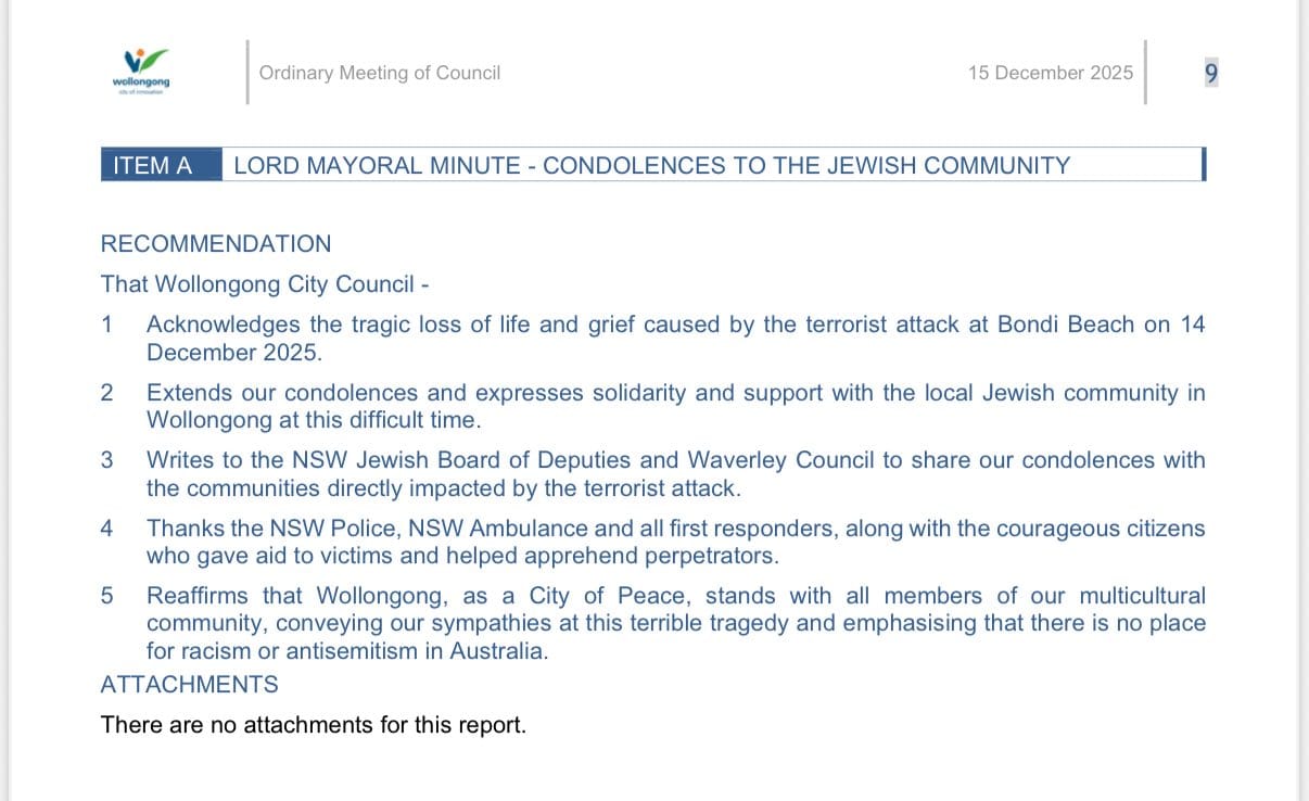 A day after the terrorist attack at Bondi Beach, Wollongong Lord Mayor Tania Brown reaffirmed that Wollongong is a city of peace and councillors observed a minute’s silence at Monday night’s council meeting.