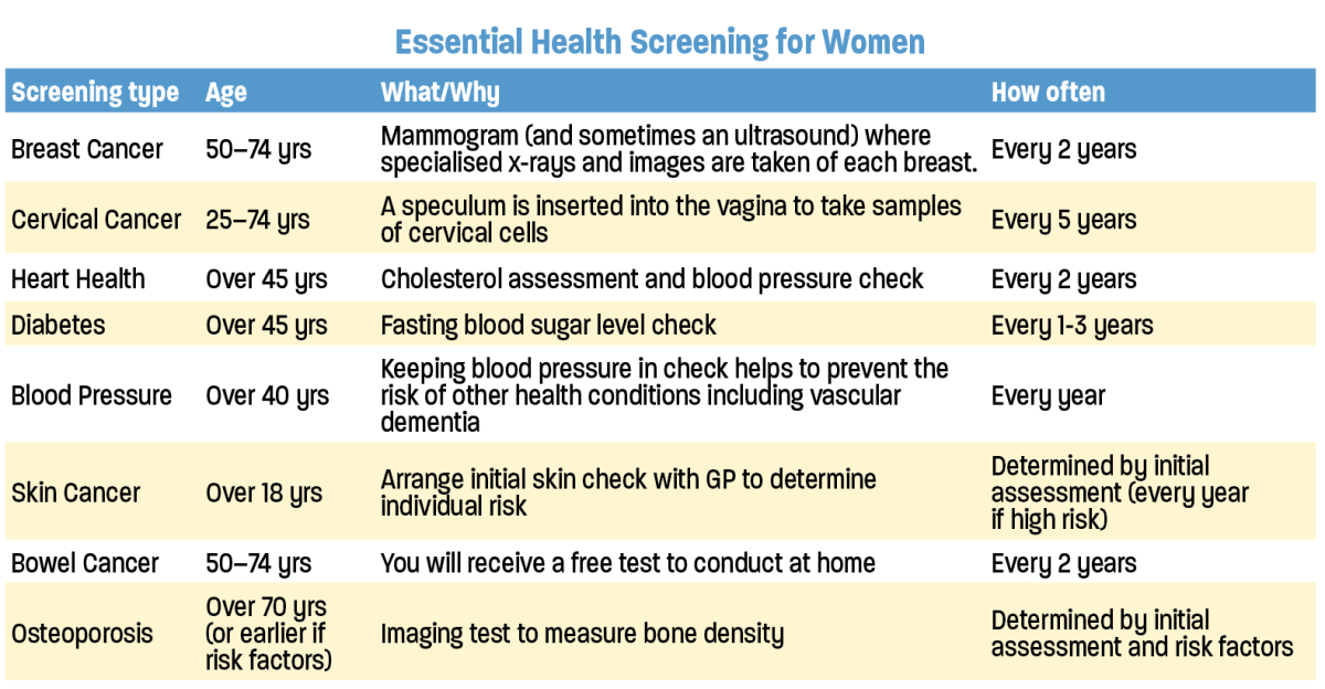 While most women know to start screening for breast and cervical cancers, they often overlook their vulnerability to bowel cancer and heart disease. These conditions cause significant mortality in women and regular screening is essential for early detection and best possible outcomes. It is important to state that these are screening recommendations but if women have any symptoms of concern it is advised they make an appointment to discuss with their GP as soon as possible.
