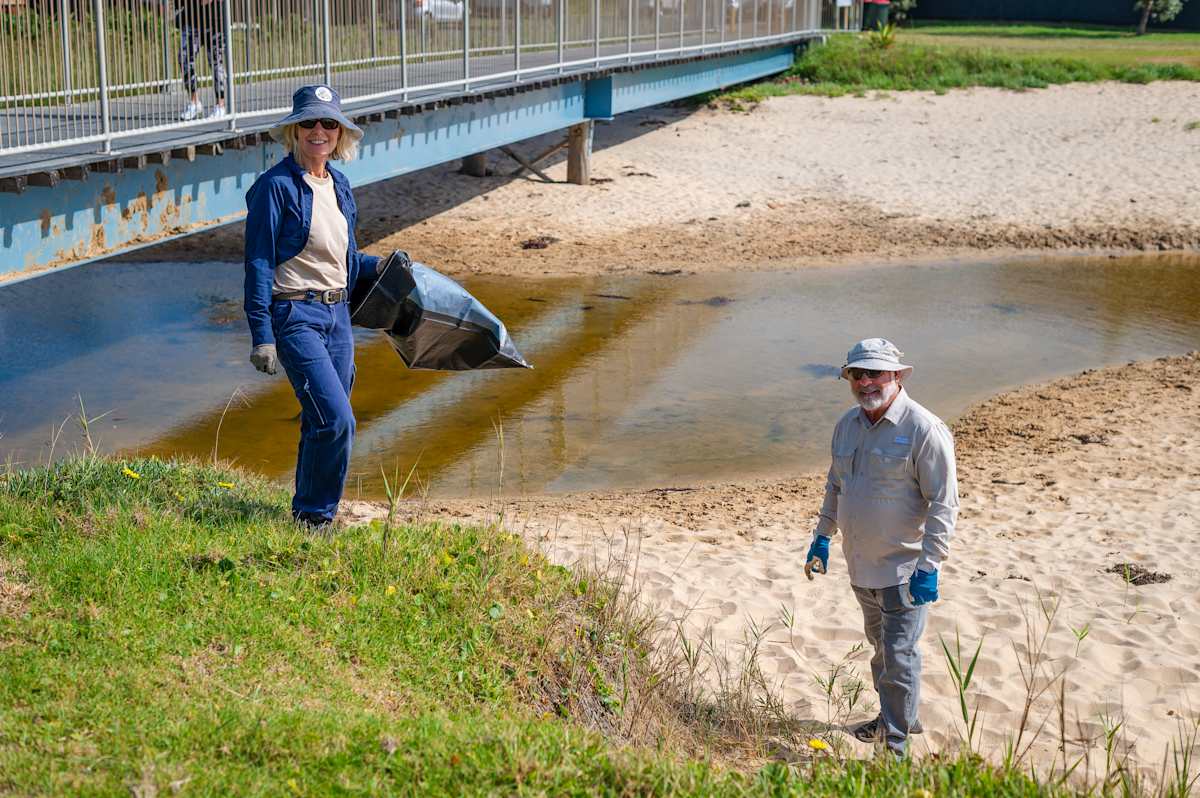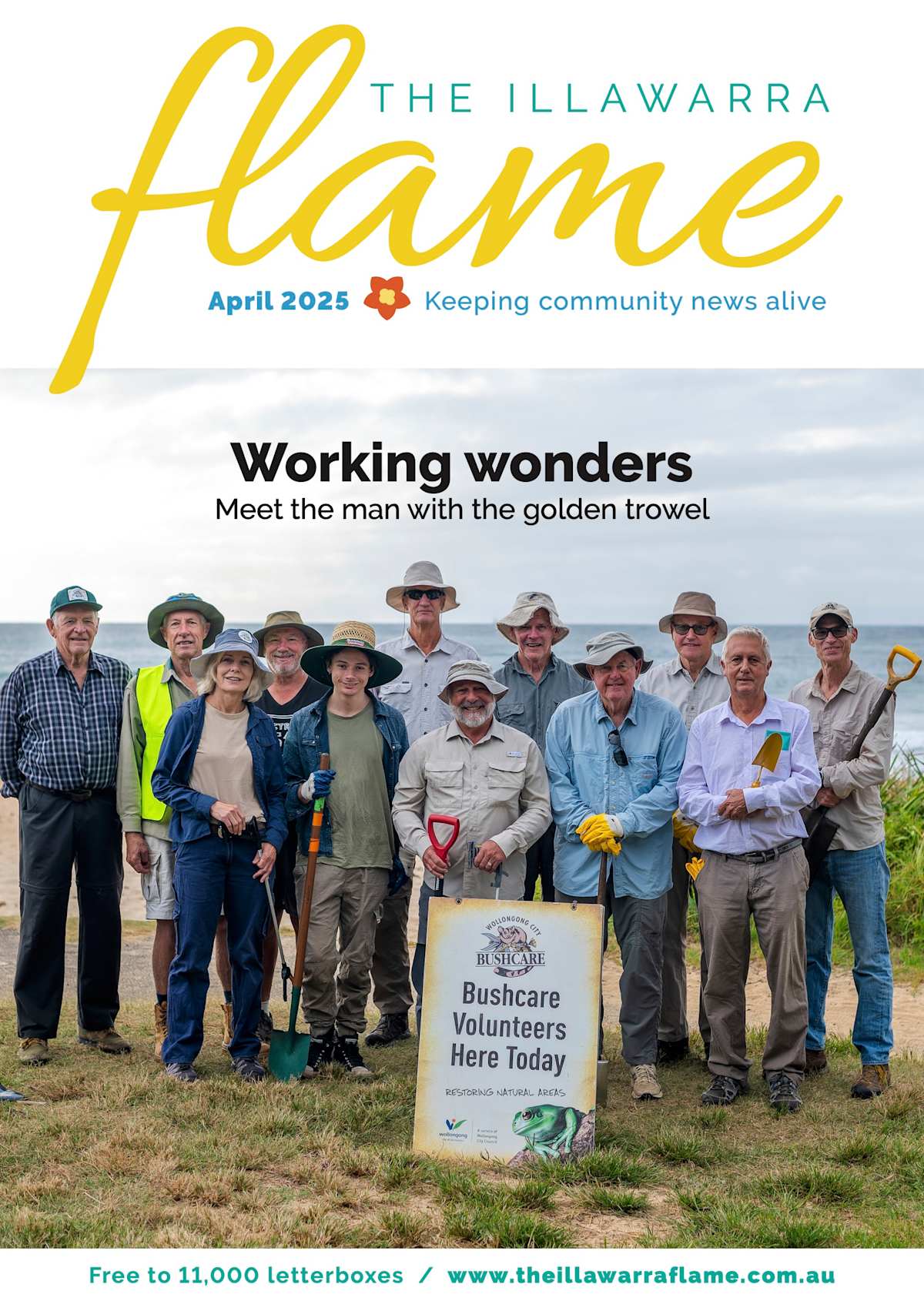 On the day the Flame visits, volunteers are doing a Bushcare shift, then a Clean Up Australia Day shift. They also take part in council’s Rise and Shine clean-up program and over the years have seen all sorts wash in, from wheelbarrows to weeds like madeira vine. After one flood, Ian found a beach dog-walking sign 40 metres upstream.