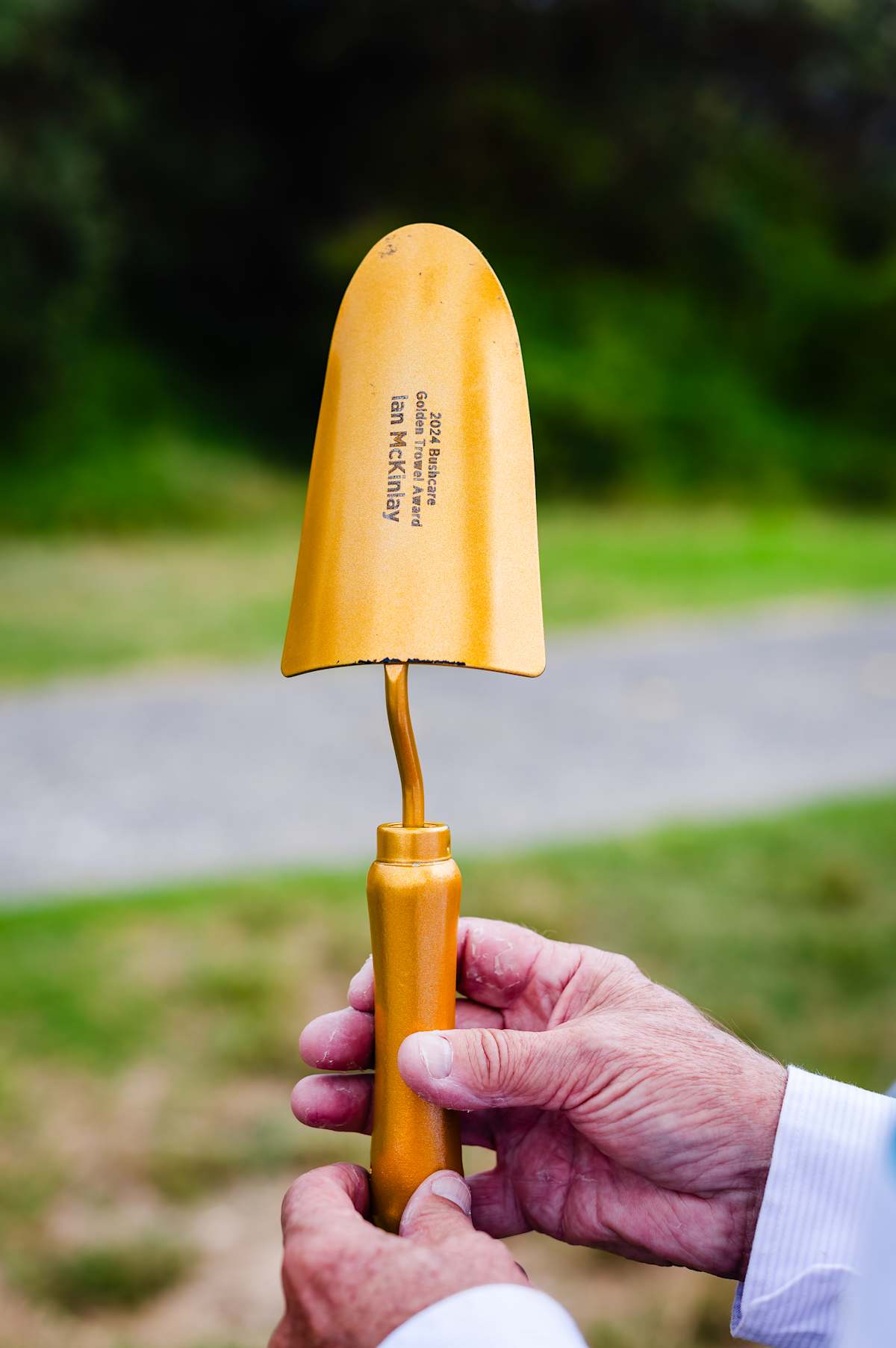 Ian McKinlay is the city’s keeper of the Golden Trowel, honoured in December 2024 at Wollongong Council’s Environment Volunteers Awards. His prize tool saw action soon after, finding a rare species of flowering ground-cover on its first outing at Woodlands Creek.