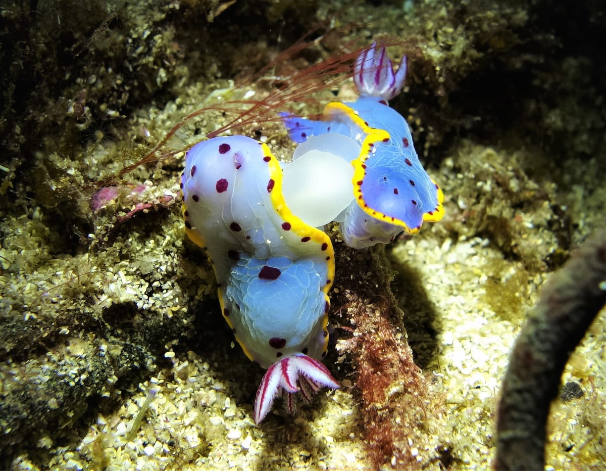 Nudibranchs are simultaneous hermaphrodites, meaning that they possess both male and female sex organs. That would certainly make their sex lives interesting! However, unlike many other hermaphroditic animals, nudibranchs do not self-fertilise. A pair of mating nudibranchs usually fertilises each other’s eggs, which are then laid in coiled jelly-like masses to await hatching.