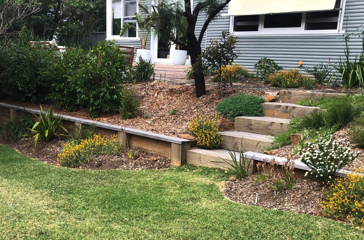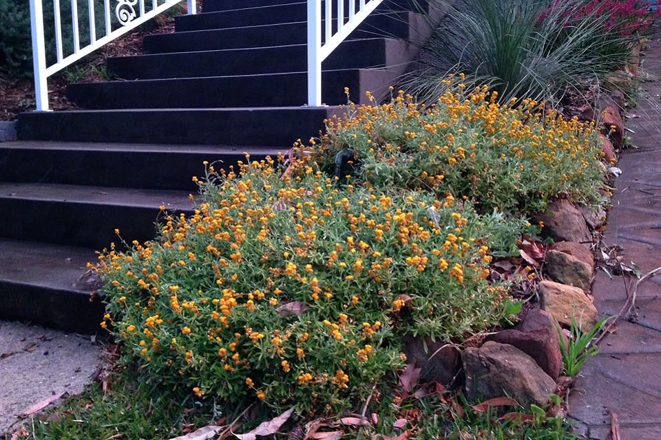 Whatever the reason, Yellow Buttons (Chrysocephalum apiculatum) remains an adaptable and appealing local species, particularly suited to part-shade conditions and well-drained soils. Below is a classic example of how Yellow Buttons is used in landscaping, with carefully managed individual plants ranged in with other species in an orderly display.