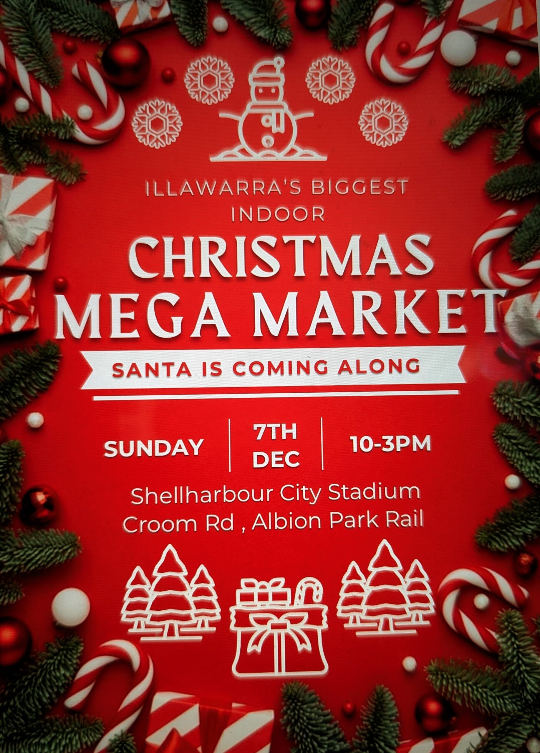 7 December 2025, Shellharbour City Stadium, 110 Croome Road, Croom, 10am-3pm, Cost $5. More than 100 stalls offering handmade goods, homewares, festive treats, and more. Free Santa photos, free Christmas craft activities for the kids, live Christmas carols and food vendors, onsite café, sweet treats, fairy floss, and ice cream.